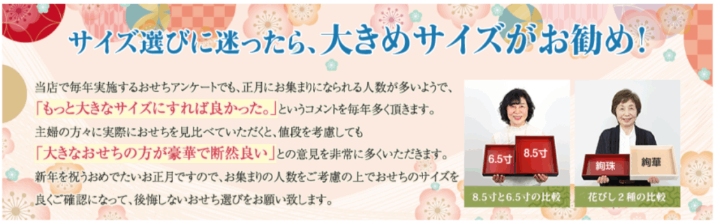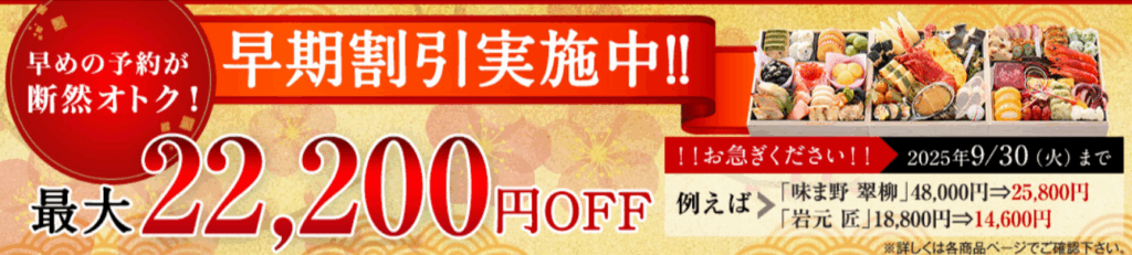 【PR】匠本舗 今年もお正月に欠かせない「おせち」の季節がやってきました。せっかくなら、華やかで豪華な料亭監修のおせちを家族で囲んでみませんか?私がおすすめするのは、通販サイト【匠本舗】の料亭おせち。全国の有名料亭や名店に監修いただいた特別なオリジナルおせちで、これまでに販売実績448万個以上・顧客満足度94%超えという驚きの数字を誇ります。日本マーケティングリサーチ機構による調査でも【おせち通販人気No.1】を獲得しているんです。 匠本舗のおせちが選ばれる理由監修料亭26屋号・50種類以上と圧倒的なバリエーション平均購入単価は18,000円超えの高品質ラインナップ実績ある通販サイトならではの高い転換率と承認率そして何より嬉しいのが、**「早割」**があること。9月・10月・12月と段階的に割引が変わっていくので、早めの注文ほどお得に購入できます。締め切り前は毎年注文が殺到するので、気になる方はお早めにチェックがおすすめ!今年はなんと【約75万個以上】を販売予定。さらに11月以降には新しい種類のおせちも追加予定とのことなので、ラインナップもますます充実していきます。 商材名 匠本舗運営者 Y.A※当サイトはアフィリエイトプログラムを利用し宣伝目的で作成しております。